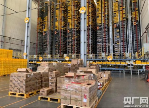 在苏宁超级云仓,货架上摆着满满当当的货物。(央广网记者 夏青 摄)