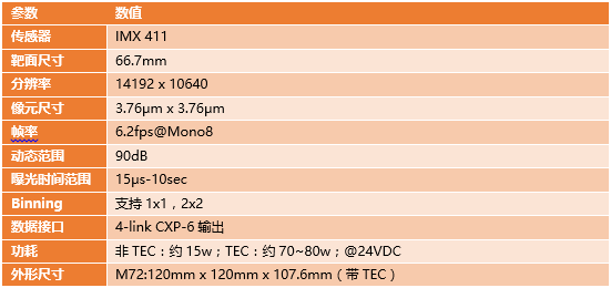 Sony IMX 411 是一款4.2寸背照RS CMOS卷帘曝光传感器:具有3.76μm像元尺寸,14192 x 10640分辨率和方形像素阵列,能够让被摄物的细节得到极致呈现。SLVS-EC高速接口,搭配CoaXPress接口能高至6.2fps。