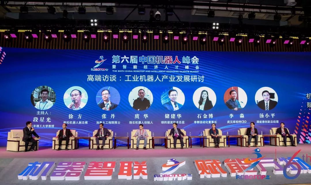 2019年5月8日至10日,第六届中国机器人峰会暨智能经济人才峰会在浙江宁波余姚举行。在9日下午的高端访谈上,新松机器人副总裁徐方、加拿大工程院院士张丹、珞石(北京)科技有限公司创始人庹华、苏州绿的谐波传动科技有限公司技术总监褚健华、李群自动化技术有限公司董事长石金博、武汉库柏特科技有限公司CEO李淼和清能德创副总裁汤小平在北京理工大学段星光教授的主持下,对工业机器人产业发展进行研讨。