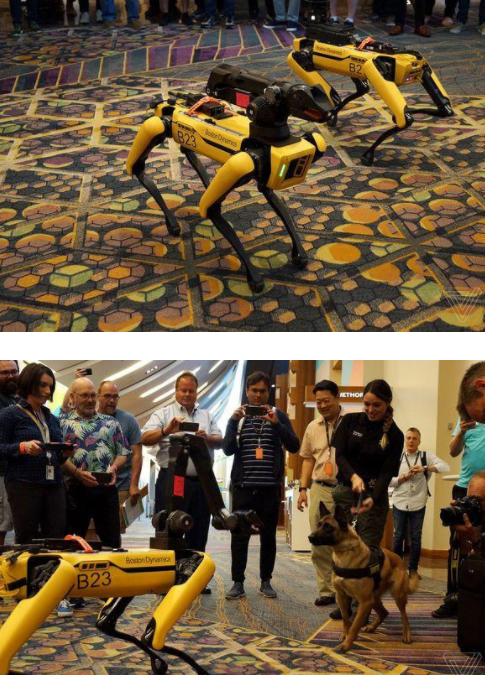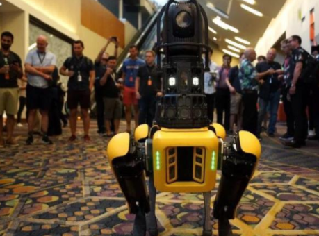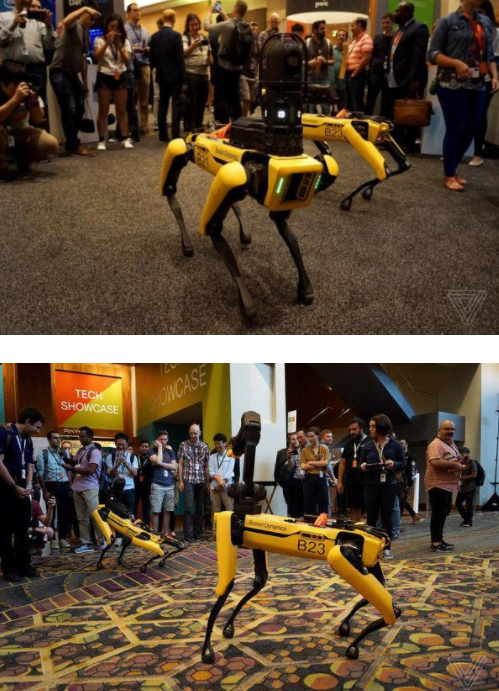 在大会的第一天晚上,两个Spot机器人和人群混在一起,并由该公司两名员工监督。它们能够自主地导航环境,能够承受踢和推,并在复杂的地形上保持平衡,但它们不会自己决定走到哪里。