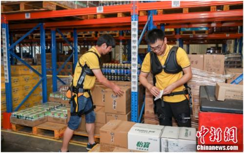 刘坤亮与同事李勇身穿“腰部助力外骨骼”在搬运货物