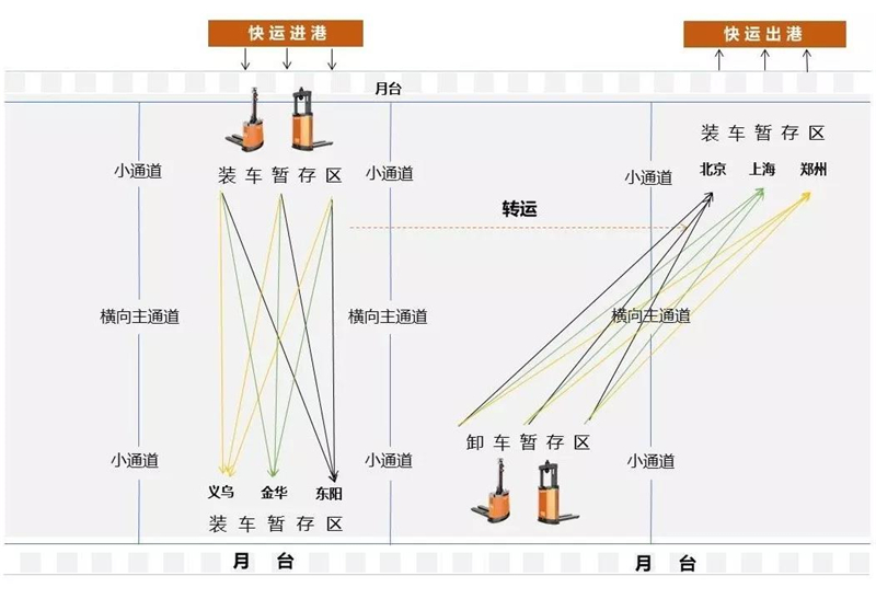 某物流公司转运仓:其仓库内业务可以归结为装卸货及货物搬运。原流程是货车到港后人工将货物卸在月台附近的暂存区,然后搬运工人操作电动叉车将托盘从卸车暂存区运输至各装车暂存区。最后再由人工将货物装车出港。