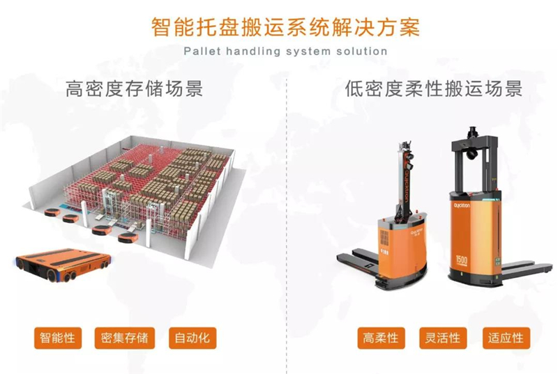 托盘搬运机器人(全向无人堆高机器人、智能托盘搬运机器人、托盘移载机器人)应用于的低密度柔性搬运场景:对于容积率要求不高但出入库或者搬运频繁场景,可以应用托盘搬运机器人进行点对点搬运及多库区或只能设备之间进行托盘接驳搬运。