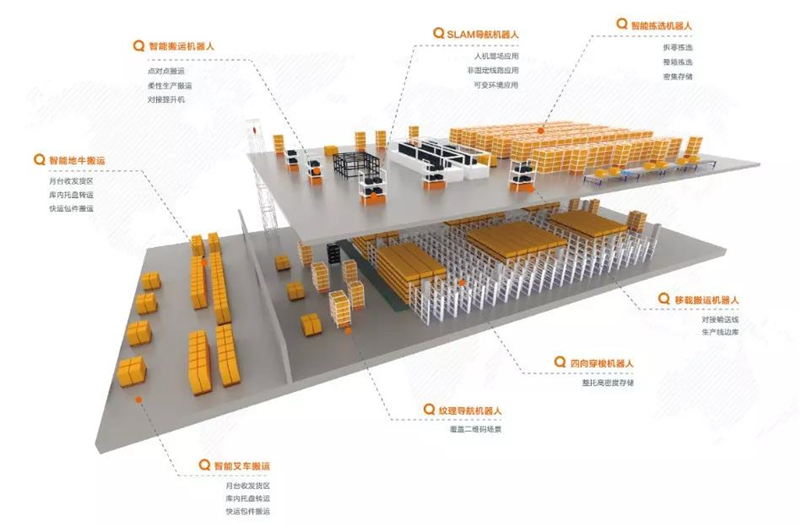 该方案主要包含两种业务场景:1、托盘搬运机器人(全向无人堆高机器人、智能托盘搬运机器人、托盘移载机器人等)应用于低密度柔性搬运场景;2、四向托盘穿梭车系统以及托盘搬运机器人可以配合应用于高密度存储场景。
