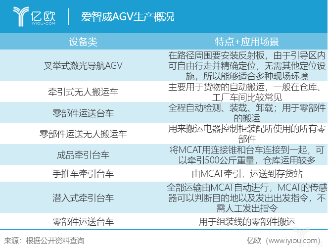爱智威专注于AGV机器人的研发、生产和销售,2010年成立于天津,2016年3月申请新三板挂牌,发展速度较快。爱智威AGV机器人按照搭载货物方式可划分为:牵引式无人搬运车、叉举式无人搬运车、潜入式无人搬运车和承载式无人搬运车。