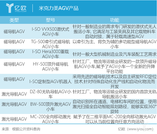 深圳市米克力美科技有限公司成立于2004年,专业研发制造AGV搬运机器人等工业制造自动化整体方案提供商。2016年,米克力美完成B轮融资。米克力美制造的I-SO智能AGV搬运机器人广泛应用在电子制造、汽车、五金、物流、食品、制药等领域。米克力美AGV产品主要可划分为磁导航AGV、激光导航AGV,具体详见下图。