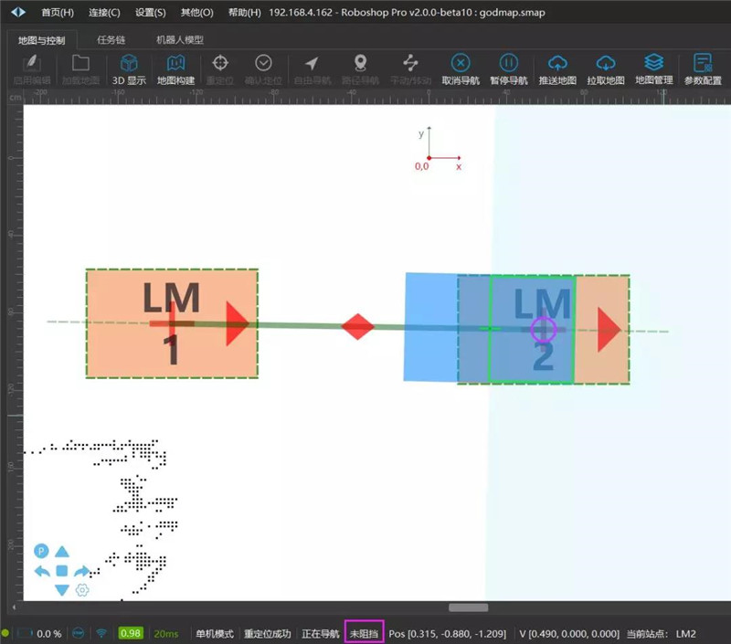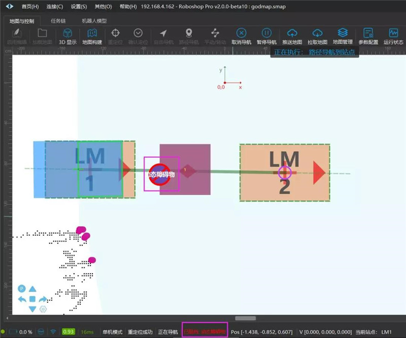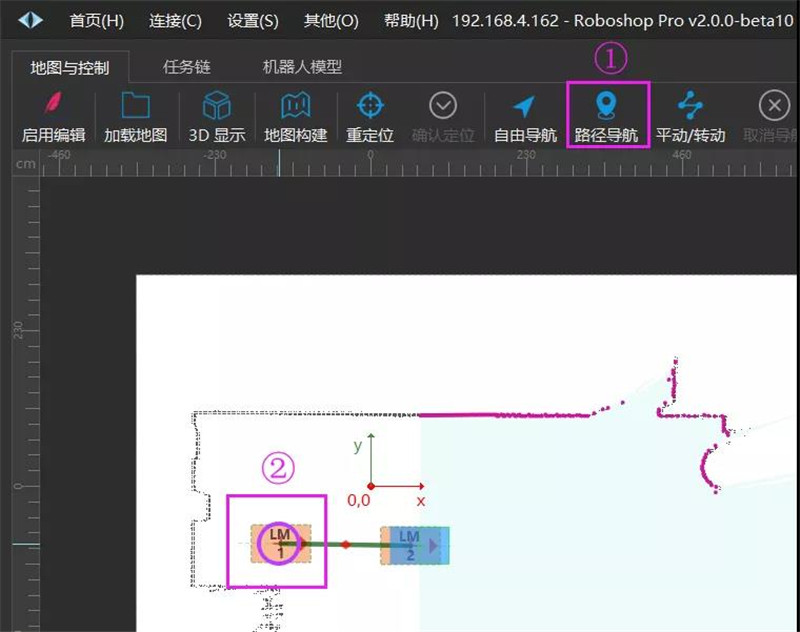 点击模块工具栏中的【路径导航】①,然后点击一个站点,如点击LM1点②,机器人会进行路径导航沿着线路运行到目标点(LM1点),且机器人到点的朝向与站点朝向一致: