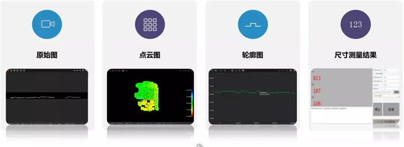 新一代线激光立体相机可通过3DMVS进行原始图、点云图、轮廓图和尺寸测量结果四种模式的预览。