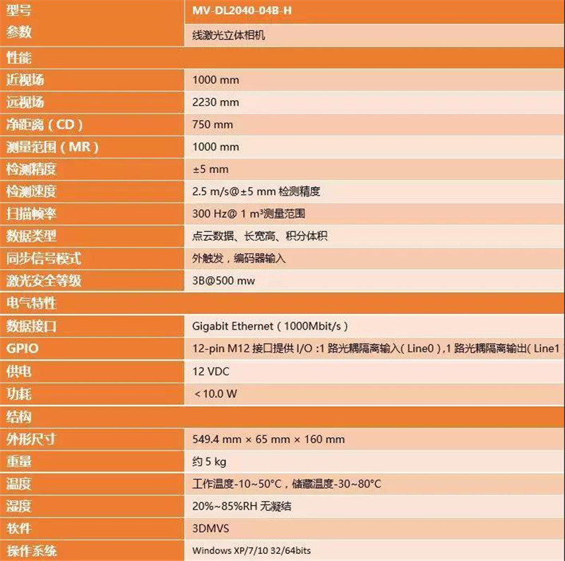 MV-DL2040-04B-H线激光立体相机,基于激光三角测量原理,通过高性能图像采集系统获取被测物表面的激光轮廓线,进而通过硬件内置的高精度图像处理算法和体积测量算法,实时输出目标物体精确的尺寸数据,在确保测量范围1m³、测量精度5mm的前提下,支持最大运动速度2.5m/s,为物流行业中高速、非接触式尺寸测量提供稳定保障。