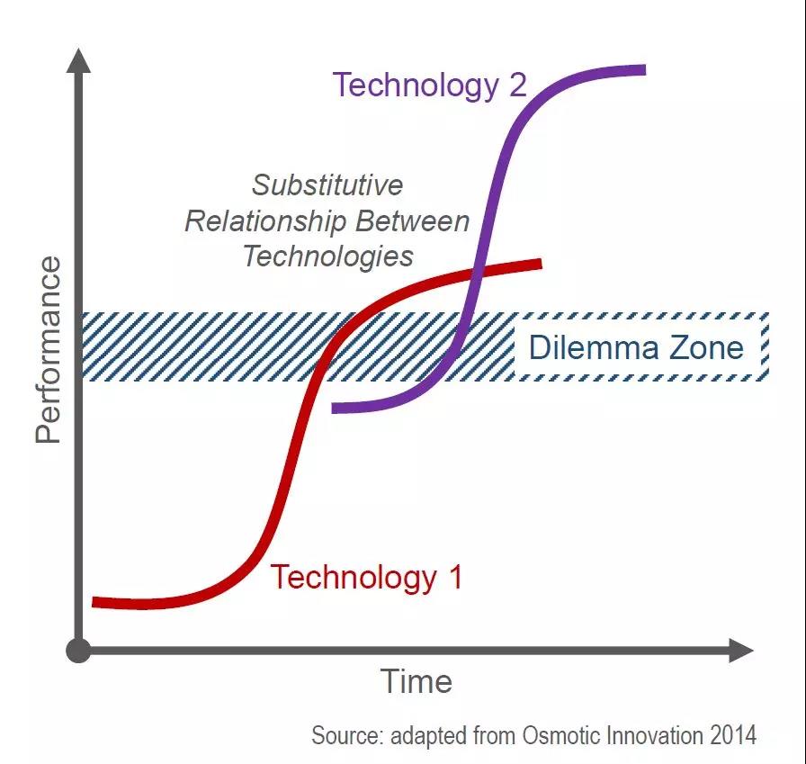 新、旧创新很难非常好的衔接,通常在传统技术的潜能已经发挥到极致,而新技术还未高速发展阶段,通常会有一个新技术窘境:DilemmaZone。