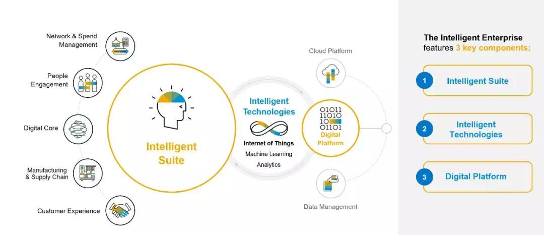 在SAP的架构中,包括三个组件:Intelligent Suite,Intelligent Technologies,和Digital Platform。其中Intelligent technologies包含6个技术,物联网是六个技术中的一个。