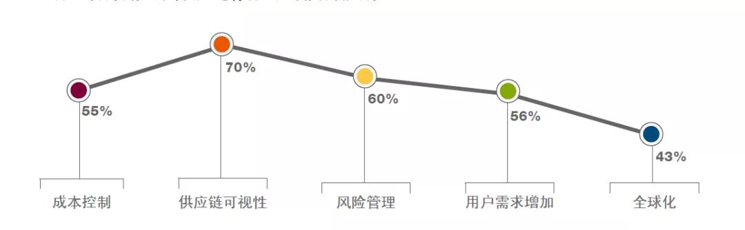 在IBM的智慧地球推广过程中,IBM曾经推出过智慧的未来供应链的报告,主要是利用物联网技术,实现供应链的可视化,优化供应链。在这个报告中,供应链主管面临五个挑战:成本控制、供应链可视性、风险管理、用户需求增加、全球化。