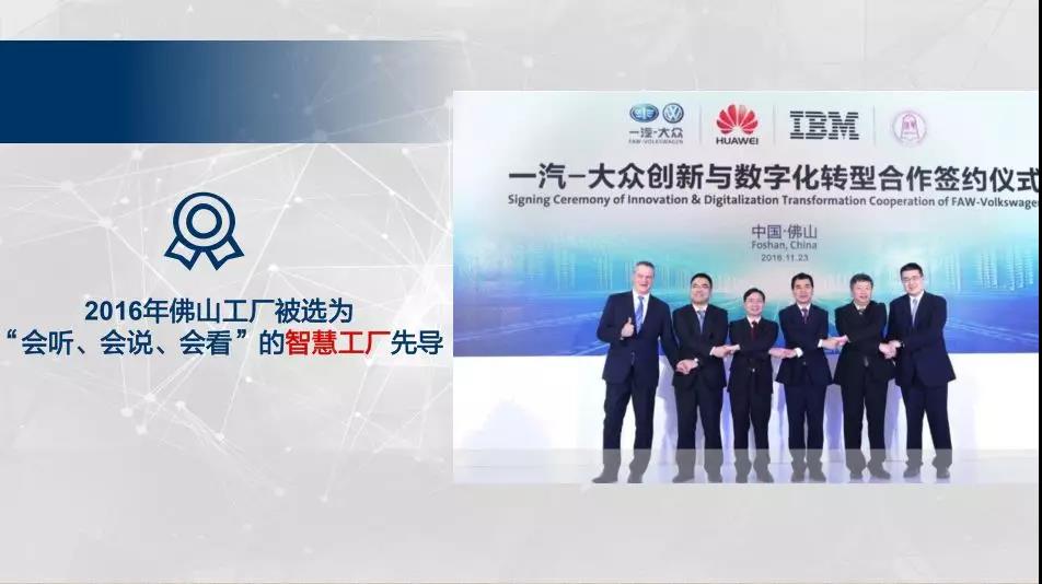 作为一汽大众智慧工厂的先导工厂,2016年佛山工厂就被选为会听、会说、会看的智慧工厂。同年12月份,佛山工厂与华为、IBM、清华大学举办数字化转型合作签约仪式,正式拉开了一汽大众数字化转型的序幕。