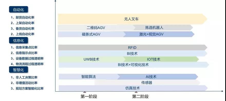 目前,佛山工厂内所有技术分类均是从上述三个层面进行部署和安排。从实施路线来看,自动化是首当其冲的目标,这里有上架自动化率、备货自动化率和上线自动化率,还有信息采集点比率、信息指示点比率等等。