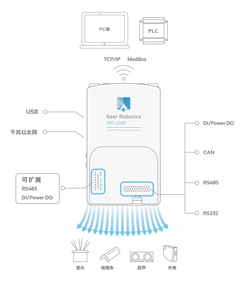 SRC系列核心控制器提供丰富的外置接口和通讯总线,包括RS232、RS485、CAN、千兆以太网、USB、DI/Power DO等;满足多种通讯协议,支持ModBus、TCP/IP协议供外部调用。