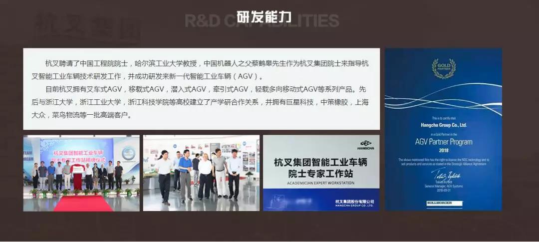 作为亚洲五金工具龙头巨星集团旗下的上市公司,杭叉的研发和创新能力一直都走在行业前列。为了打破智能工业化车辆的技术壁垒,杭叉聘请了中国工程院院士,哈尔滨工业大学教授,中国机器人之父蔡鹤皋先生作为杭叉集团院士,来指导杭叉智能工业车辆技术研发工作,成功研发来出新一代智能工业车辆。根据不同的生产场景,杭叉先后生产出了叉车式AGV,移载式AGV,潜入式AGV等一系列产品。