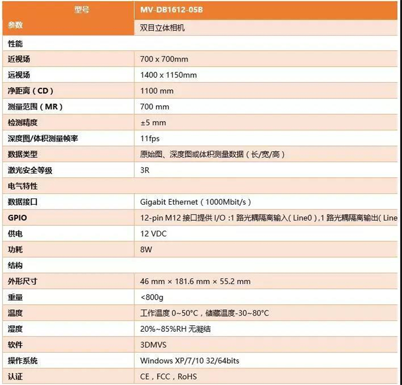 新一代双目立体相机MV-DB1612-05B可在更大的视野范围下保证更高的精度以及稳定性。在物流行业静态体积测量和3D定位等应用中有非常广阔的扩展空间。