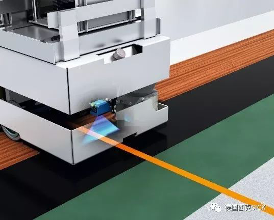 而“荧光导航”的路线是以荧光颜料制作的色带。荧光导航传感器发射经调制的紫外光,荧光色带上的荧光物质会被紫外光激发,发射出波长在可见光光谱范围内(约420 nm 到750 nm)的可见光。荧光导航传感器会接收此光线,从而测量判断色带与AGV的相对位置(SICK荧光导航传感器OLS系列可精确至+/-1mm),从而使小车沿既定路线行驶。