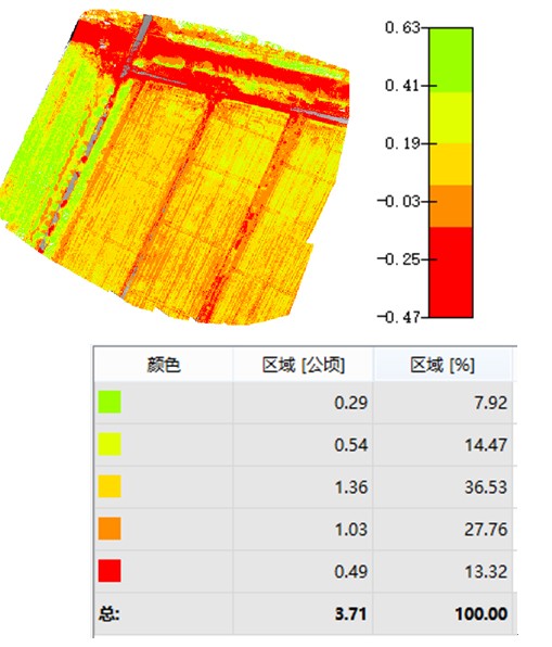 图表体现了这个区域本时段植被分布情况以及植被覆盖比值。鉴于这种情况,我们可以对这个区域作定期监测,同样以NDVI指数作为参评标准,这样可以得到农作物生长期的发育状况,作为产量评估和虫害评估的主要依据,对时时高效的监测作物生长状况,提高作物的实际产量具有显著意义。