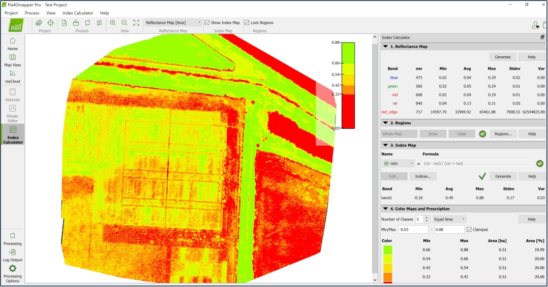 可以采用五镜头多光谱相机RedEdge-MX,分别对应红光、绿光、蓝光、红边、以及近红外,或者采用带RGB通道的五镜头相机Sequoia。根据采集的数据选择归一化差分植被指数(Normalized Difference Vegetation Index, NDVI)来综合反映农作物的生长分布和覆盖情况。