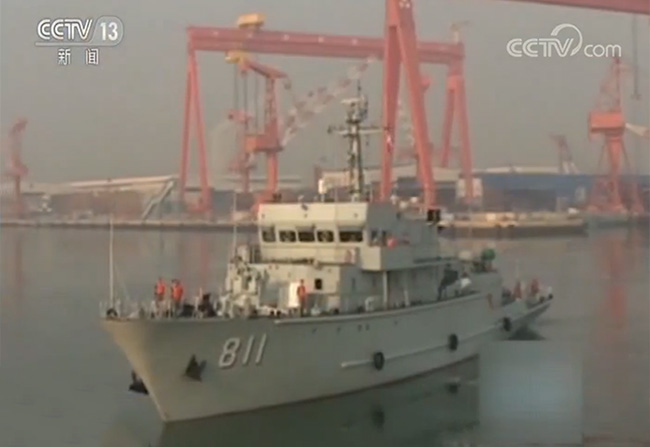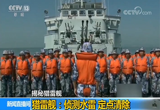 记者:我现在所在的位置就是在一艘名叫开平舰的猎雷舰上,它与扫雷舰的最大区别就是猎雷舰具有侦测水雷的能力,具体的情况我们请开平舰的副舰长孙义来给我们介绍一下。