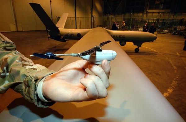 图为2014年英国空军沃丁顿基地公开日上,英军士兵手持“黑蜂”微型无人机与“守望者”高空长航时无人机合影,可见两者的尺寸差距。