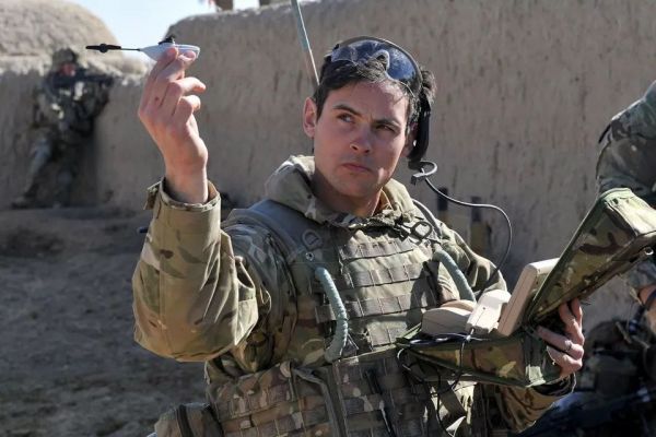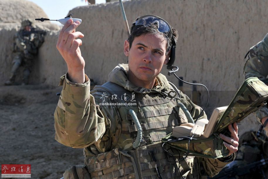 正在使用“黑蜂”无人机的英军士兵,注意他手持的操纵手柄。
