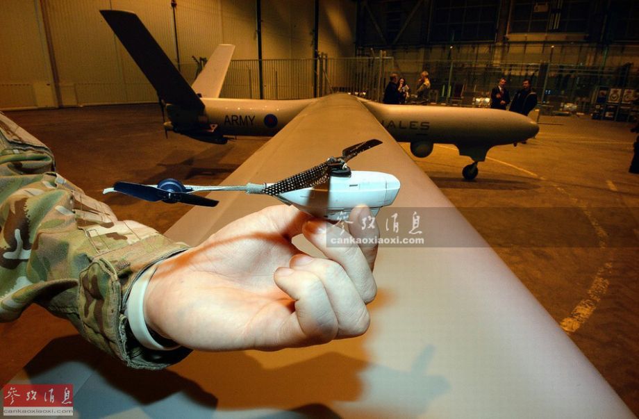 图为2014年英国空军沃丁顿基地公开日上,英陆军士兵手持“黑蜂1”无人机与“守望者”高空长航时无人机合影,可见两者的尺寸差距。