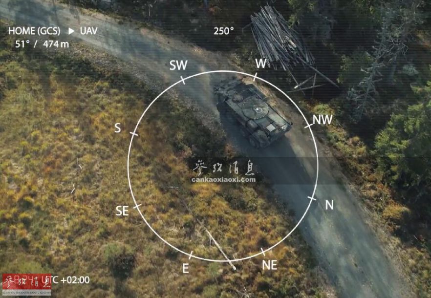 “忒弥斯”无人战车可利用“黑蜂”无人机从空中监视战场,“黑蜂”发现敌军目标后,可通过保密数据链向后方指挥部实时传送视频影像及目标数据,“忒弥斯”则可在伏击区等待目标进入武器射程。图为“黑蜂”无人机向后方指挥部传回的敌军战车视频。