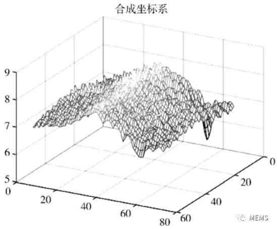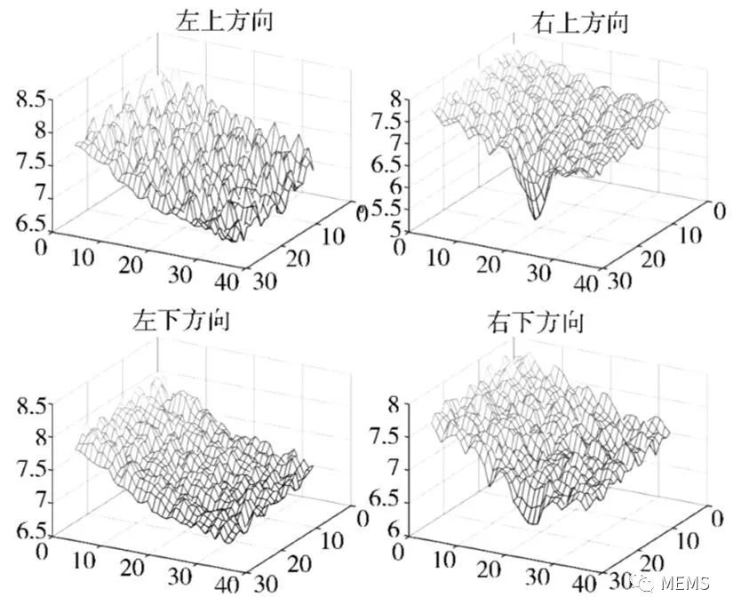 分析从4个方向计算结果,在右上方有最小值,所以判断第2帧图像在第1帧图像的右上方,将4个方向的计算结果合成在一个坐标系下,结果如图10所示。