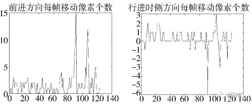 试验用CCD摄像头设定为320 x 240像素,β系数设定为0.9,帧率120 FPS。小车直线向前行驶距离,其中约1 s的数据如图11所示。