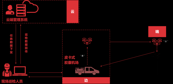 【云-边-端】方案架构,有效连接中央管理系统、固定机场和无人机。云端中央管理系统负责任务的统一下发和巡检数据管理及多机场的监控,实现从一到多个变电站的统一管理,扩大智能运检的作业半径。