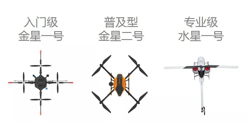汉和航空拥有三款主打产品,入门级多旋翼金星一号,普及型多旋翼金星二号,专业级单旋翼水星一号。