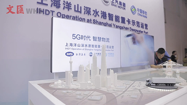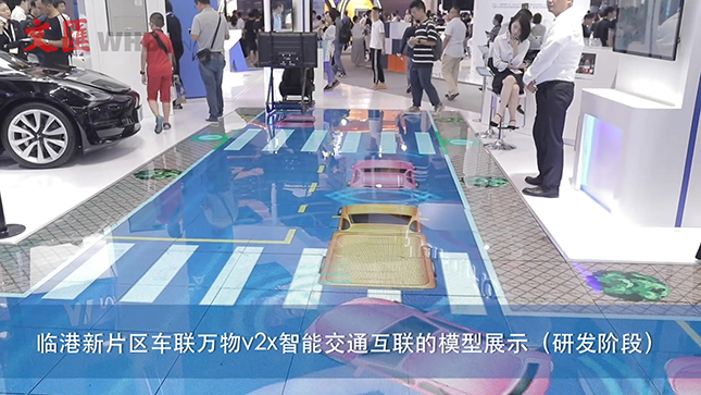 展台地面上,铺设了尚在研发中的临港新片区车联万物v2x智能交通互联模型,模型展示了车联万物的概念。如果行人在非人行道区域行走,周边的车辆都会为行人让行,以避免交通事故。