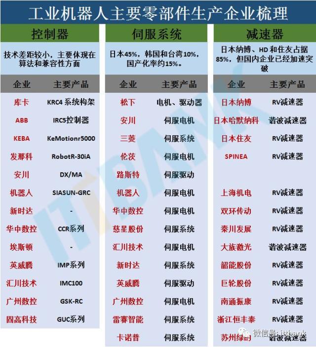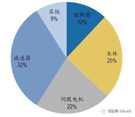 整体来看,工业机器人的总成本中,核心零部件的比例接近70%,其中减速器、伺服电机和控制器占比分别为32%、22%和12%。