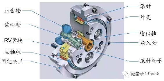工作原理:1.第一减速部:伺服电机的旋转从输入齿轮传递至正齿轮,按二者的齿数比进行减速;曲轴直接与正齿轮相连,以相同的转速旋转。2.曲轴部:曲轴旋转,带动偏心部的RV齿轮进行偏心运动。3.第二减速部:另一方面,针齿数目比RV齿轮的齿数多1个;如果曲轴旋转1圈,RV齿轮与针齿接触的同时进行1圈的偏心运动,使得RV齿轮沿着相反方向旋转1个齿数的距离,并通过曲轴传递至输出轴,实现减速。而总体减速比为第一、第二减速部的减速比之积。