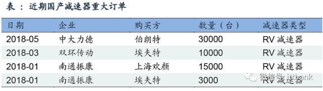 国内企业减速机业务推进顺利,订单频传。2017年以来,减速器国产化进程显著加快,根据中大力德公告的披露,公司将于2019年底之前向伯朗特供货RV减速器不低于30000套;根据公告的披露,埃夫特将采购双环传动的RV减速器一万套;根据公司官网的披露,南通振康将分别向上海欢颜、埃夫特批量提供减速器。根据上海机电年报的数据,旗下的纳博精机于2015年10月投产,目前已经达到10万台产能,并于2017年5月开始实现单月盈利,目标早日达到20万台的产能。除此之外,中技克美成为国内第一家上市的谐波减速器企业,产能2万套,其中50%-60%用于军工领域。秦川机床、中大力德、来福谐波也分别开发了系列产品,进入量产阶段。