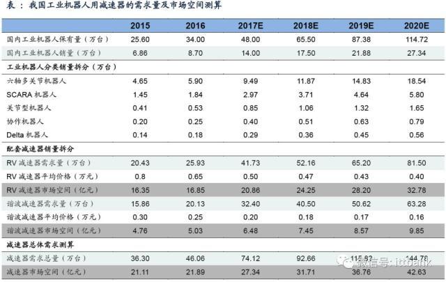 减速器市场测算逻辑:根据IFR的预测,按照类型划分未来工业机器人需求量,进一步按每种类型的机器人所需的RV和谐波减速器数量,来预测总体市场需求和空间。