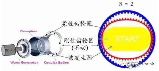 基于行星齿轮传动发展起来,由波发生器、柔轮、刚轮和轴承组成。其工作原理在于依靠波发生器使柔轮产生可控弹性变形,而柔轮比钢轮少N个齿轮位。因此,当波发生器转一圈,柔轮移动N个齿轮位,产生了所谓的错齿运动,从而实现了主动波发生器与柔轮的运动传递。谐波减速器是通过柔轮的弹性变形来实现传动,其优势是传动比大、零部件数目少;其缺点是弹性变形回差大,这就不可避免地会影响机器人的动态特性抗冲击能力等。