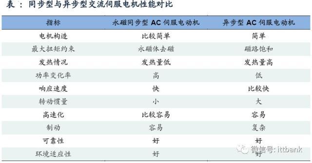 交流伺服电机也称为无刷电机,分为同步和异步电机。异步电机负载时的转速与所接电网的频率之比不是恒定关系,有较高的运行效率和较好的工作特性,从空载到满载范围内接近恒速运行,能满足大多数工农业生产机械的传动要求。而同步电动机的功率因数可以调节,最高转动速度低,且随着功率增大而快速降低,因而适合做低速平稳运行的应用。在不要求调速的场合,应用同步电动机可以提高运行效率。到目前为止,高性能的伺服系统大多采用永磁同步型交流伺服电动机,典型生产厂家如德国伦茨、路斯特、西门子、日本安川等公司。