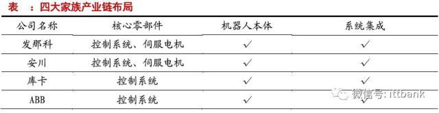 四大家族在工业机器人行业从上游零部件、中游本体到下游系统集成均有布局。像KUKA机器人业务分为本体和系统集成两大块,发那科通过外延并购布局系统集成业务。工业机器人是载体,具体行业应用是焦点,两者兼具的话,本体和系统集成形成联动,渠道相互促进,有望提升产品在行业的影响力,分到更大的市场份额。