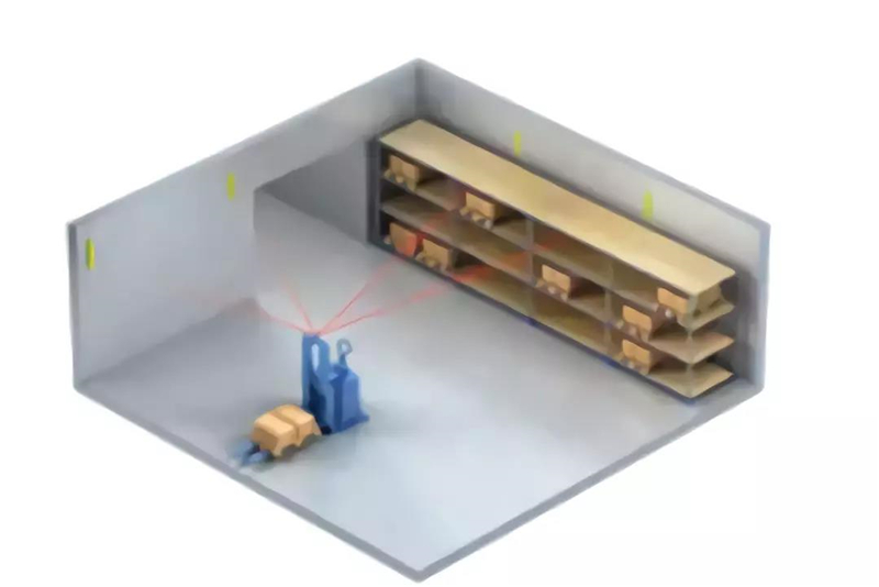 在激光导航AGV发展历史中,最早使用的是基于反光板的激光导航,通过激光雷达持续地发射激光脉冲,由旋转机构将激光脉冲按一定角度间隔(角度分辨率)发射向扫描角度内的各个方向而形成一个以径向坐标为基准的二维扫描面。激光雷达通过识别扫描范围内的物体表面反射率,来识别激光反光板的位置信息,再通过最少三个反光板的位置计算出激光雷达所在的AGV的位置和姿态信息。
