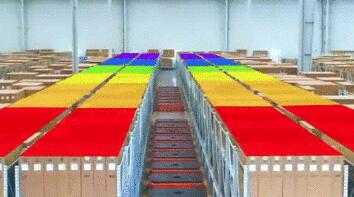 将预测得到每种物料未来一天的出库量作为衡量物料冷热度的关键指标,判断货架的冷热度,再调度机器人实时动态调整货架位置。如下图,红色区块代表高热度货架,会优先排布到离拣选台更近的地方。