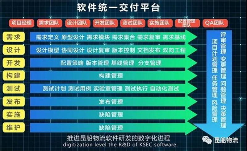 “软件统一交付平台”项目属昆船公司物流装备综合能力建设项目三期工程,本项目的建设目标是实现昆船物流工程项目和科研项目的软件开发过程,通过构建企业级的软件统一交付平台,涵盖软件产品需求开发与管理、设计构建、协同管理、配置管理、质量管理,贯穿于支撑物流软件产品开发和项目开发所涉及到的各环节和部门,满足昆船物流的需求、设计开发、测试和实施团队的使用需求,实现软件产品开发生命周期的全流程管理,加速软件交付速度,实现高效团队协作,获得更高的软件生产率。