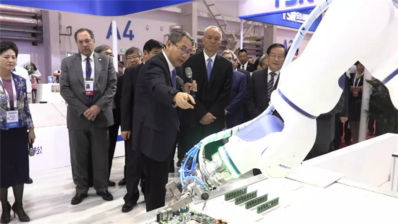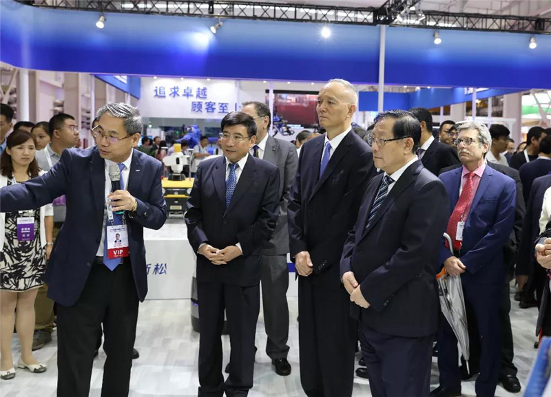 下午开幕式结束后,中央政治局委员、北京市委书记蔡奇,全国政协副主席、中国科学技术协会主席万钢,北京市委副书记、市长陈吉宁,工业和信息化部部长苗圩,中国科学院院士怀进鹏等相关领导一行,莅临新松展位参观指导。新松公司总裁曲道奎、副总裁兼战略与市场总监张进等接待了来访领导。