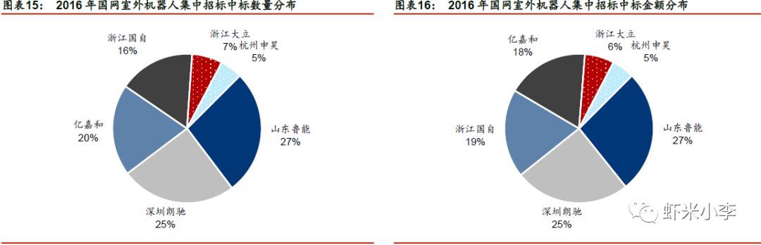 变电站巡检机器人行业市场格局较为集中。变电站巡检机器人行业主要参与者有6 家:山东鲁能、深圳朗驰、亿嘉和、浙江国自、浙江大立、杭州申昊。从2016 年国网室外机器人集中招标中标数量/金额来看,山东鲁能和深圳朗驰居第一梯队,市场份额均在25%以上;亿嘉和与浙江国自属于第二梯队,市场份额在16%~20%之间。2017 年亿嘉和的室外机器人中标率较低,主要是因为南网/国网浙江的客户基础尚浅。随着各省级电力公司自主采购规模扩大,亿嘉和通过研发投入与产品快速迭代,仍然是变电站巡检机器人行业有力的挑战者。