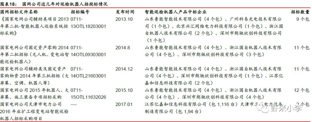 我们测算2018-2020 年变电站/配电站巡检机器人市场空间分别为72/405 亿元。亿嘉和招股说明书数据显示,国家电网自2013 年开始集采变电站巡检机器人,截至2017 年保有量约1,000 台,2020 年国内110KV 及以上的变电站数量将超过3 万个,需求缺口大;2015-2017 年亿嘉和的配电站巡检机器人销量分别为50/270/448 台,呈高速增长态势。如果智能电网无人巡检推进顺利,我们测算2018-2020 年国网系统巡检机器人市场总需求约为477 亿,年均市场需求约159 亿;其中,变电站巡检机器人合计9,000 台,市场空间72 亿元;配电站巡检机器人合计8.1 万台,市场空间405 亿元。
