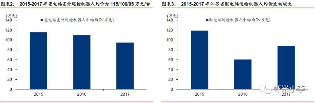 4)从节约成本的角度,每台巡检机器人相当于6 个巡检人员。根据我们的调研数据,每个变电站平均巡检人员数量4 人,配置巡检机器人后每个变电站只需保留一人,每个巡检机器人服务两个变电站计算,则每台巡检机器人可节约巡检人员6 人。国家统计局数据显示,2017 年电力、煤气及水的生产和供应业就业人员平均工资约为9 万元/年。考虑到电力巡检人员属于一线人员,我们假设其平均工资为6 万元/年,则每台巡检机器人每年节约人员工资36 万元,以每台变电站巡检机器人80~110 万元采购成本计算,3 年左右即可收回成本。