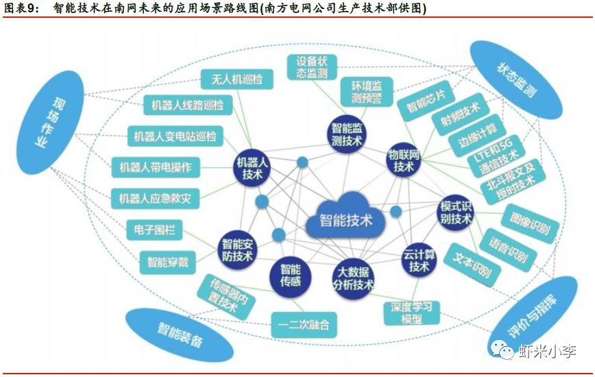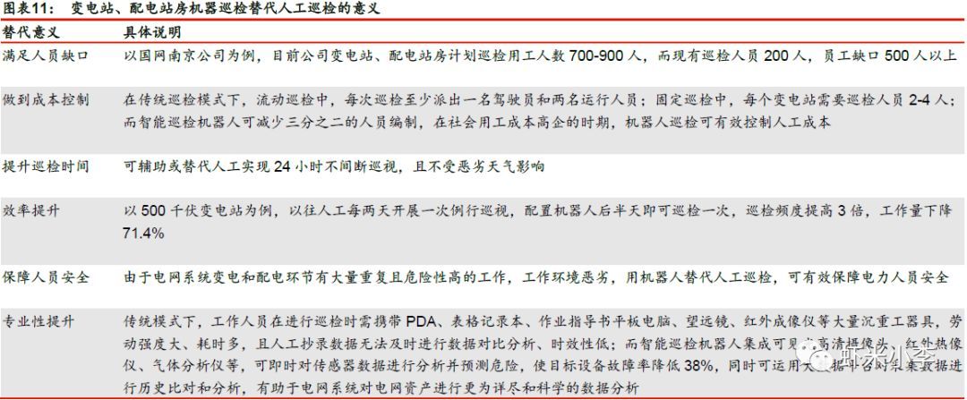 南网自2016 年开始全面推行“机巡+人巡”运维模式。南网公司在2013 年底首个变电站智能巡检机器人投入使用后,推广应用工作开始逐步展开;2016 年,南网“十三五”部署全面推行“机巡+人巡”运维模式,指出要推广智能作业、无人机、机器人等先进技术,加快推进设备在线监测、带电检测,开展机器代替人、“互联网+”、大数据的研究应用。2018 年5 月,南方电网正式提出《智能技术在生产技术领域应用路线方案》,机器人技术有望全面应用于南网系统现场作业。
