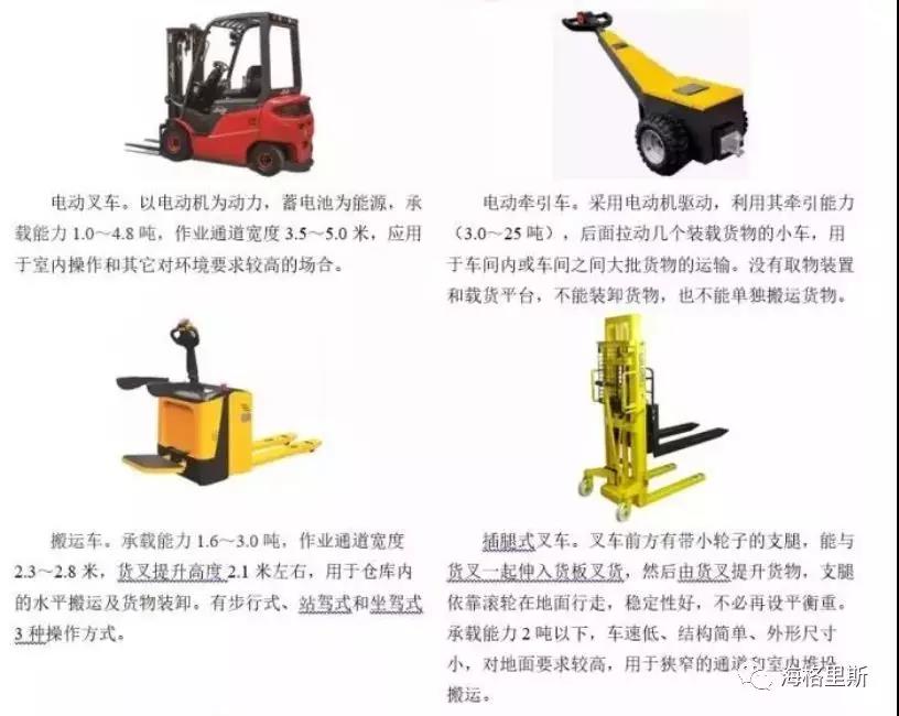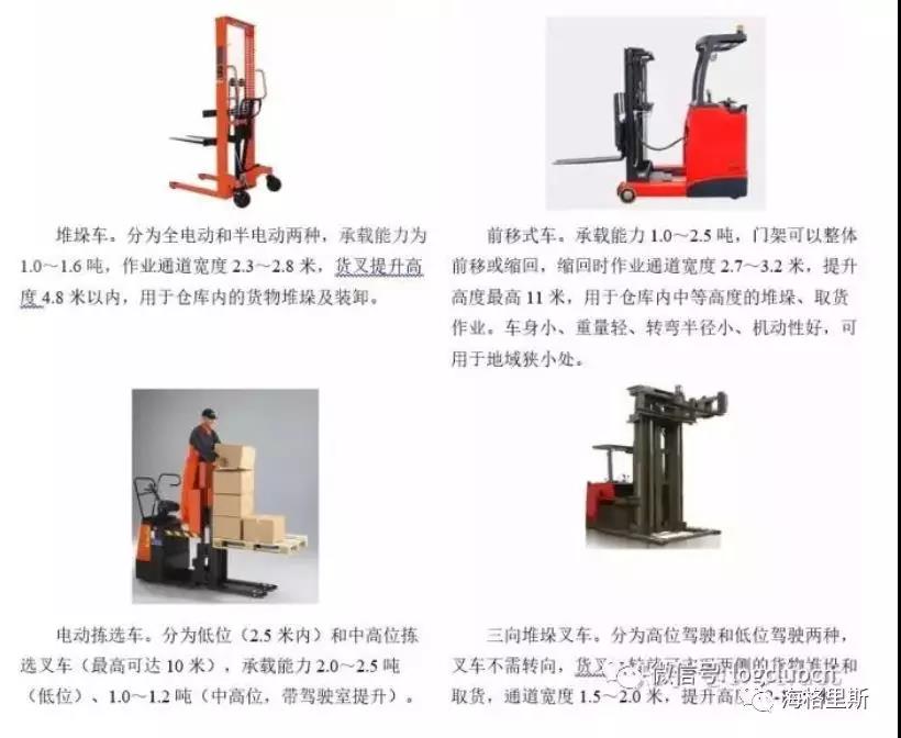 搬运设备。包括通道宽度、需举升高度与重量、叉车旋转半径,如根据堆高机的举升高度及能力确定通道宽度。